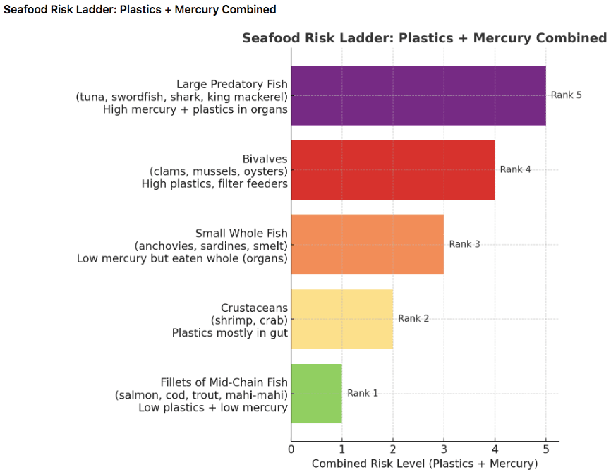- Small whole fish (anchovies, sardines, smelt): Riskier since eaten whole (gut, liver, kidneys) → higher microplastic exposure.